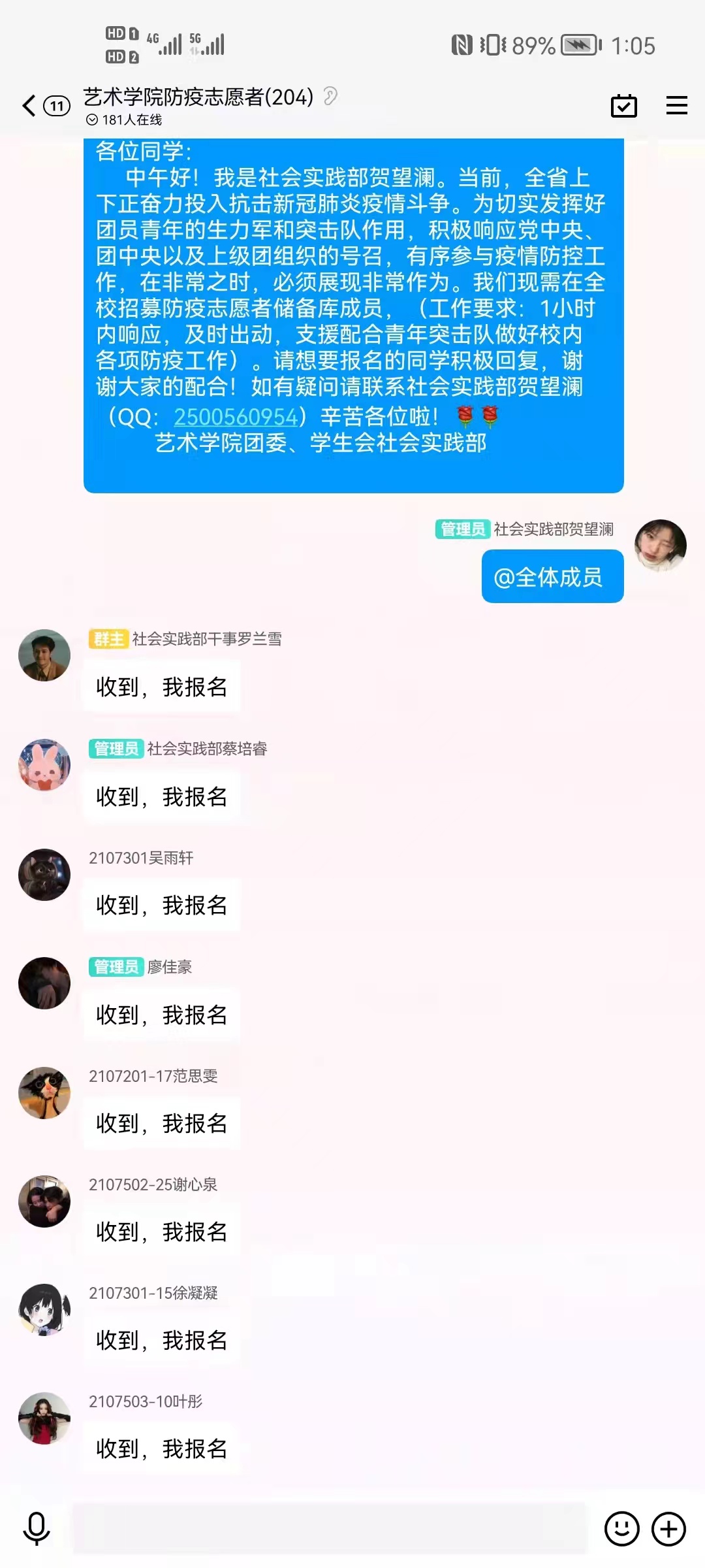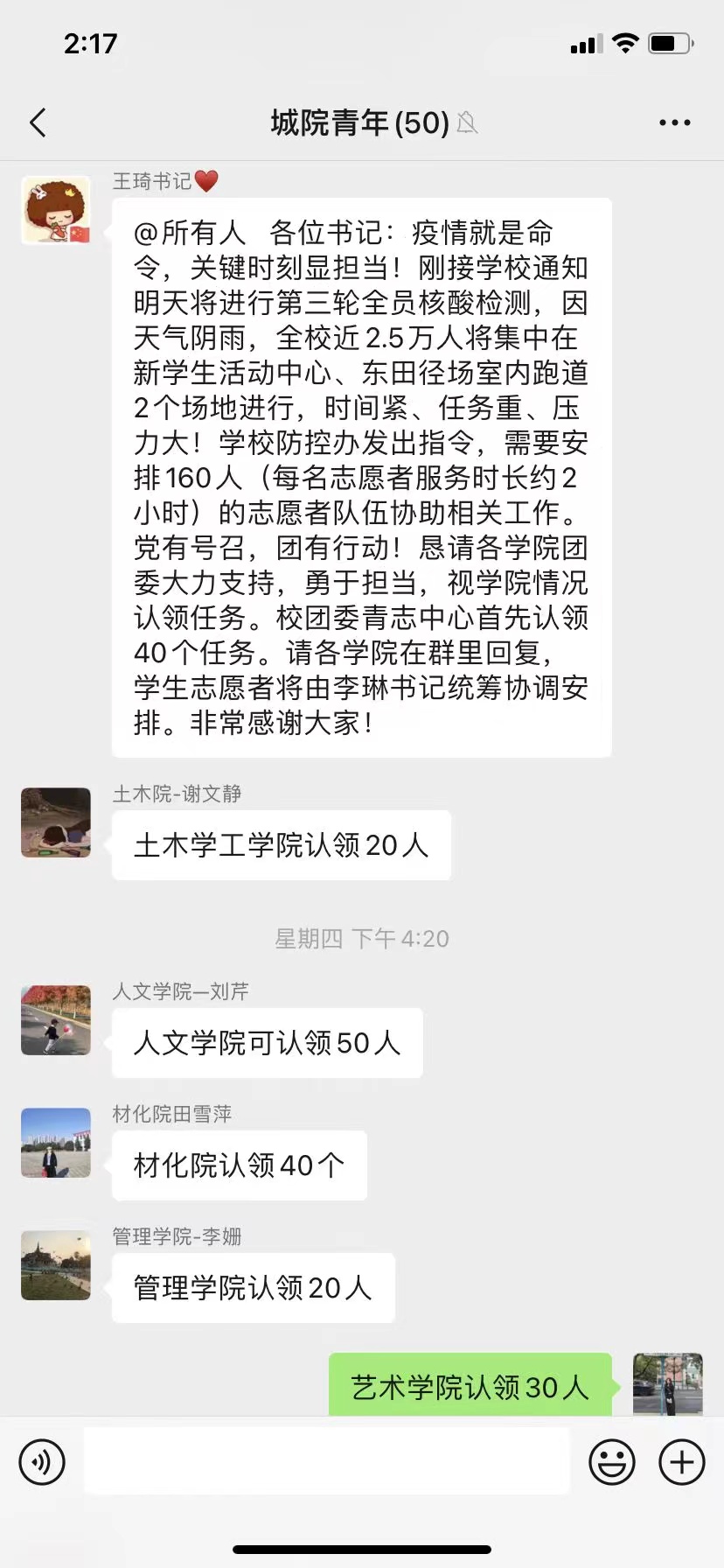 因疫情防控需要,公司近2.5万人要进行第三轮核酸检测,时间紧、任务重、压力大,为协助工作更好地开展,在“城院青年”群内,校团委书记王琦发出了“党有号召,团有行动”的志愿者招募,艺术公司第一时间主动认领40个志愿者名额,160个志愿者岗位5分钟内认领一空。3月25日下午13:30—16:00,艺术公司志愿者们身穿红马甲,帮助医护人员传递物资、健康扫码、保持现场采集人员“一米”距离等等,保证了现场防疫工作的井然有序。