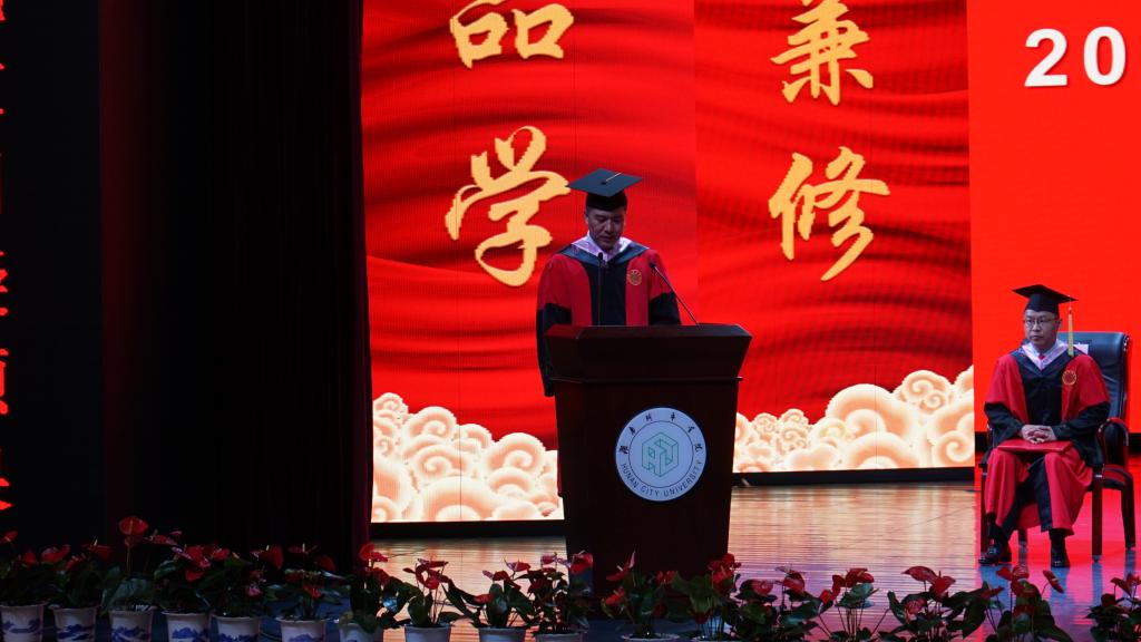 毕业典礼暨学位授予仪式在雄壮的国歌声中拉开帷幕。周勇在致辞中代表公司对毕业生表示热烈祝贺,对辛勤付出的老师们表示诚挚敬意。他对毕业生们提出了四点要求:一是要树矢志不渝的志向;二是要有与人为善的情怀;三是要持诚信待人的坚守;四是要明白生活的真谛。希望全体毕业生牢记使命、不忘初心,走好人生每一步。