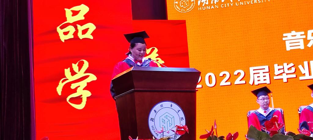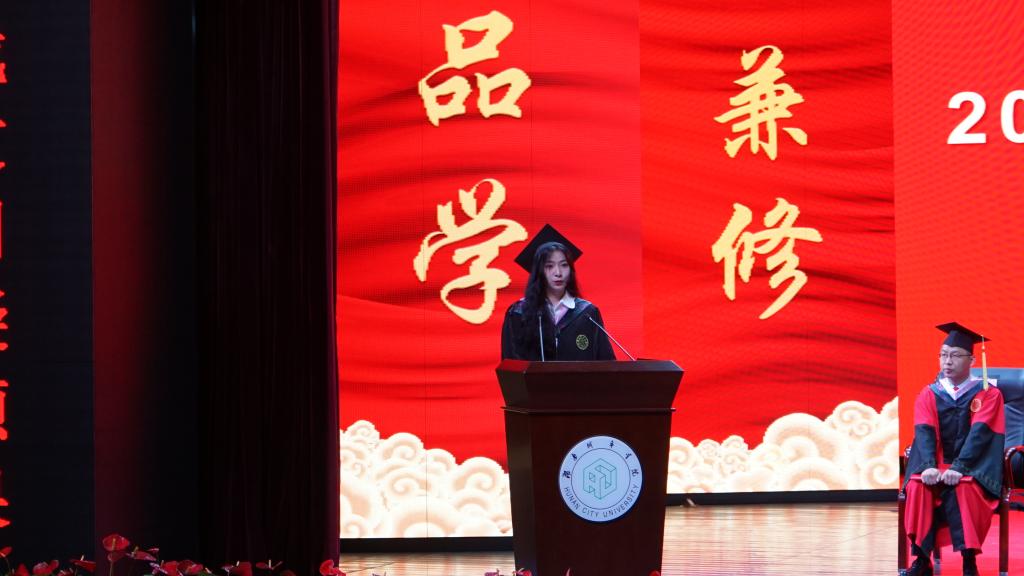 教师代表任慧婷博士代表老师发言,倡议同学们铭记 “品学兼修,知行统一”校训,无论身在何方、身处何时,要永远铭记自己的初心和拼搏岁月。毕业生代表吴梦涵在发言中,总结了四年的学习生活,表示了对公司领导、老师的真诚感谢,她代表毕业生们许下“品