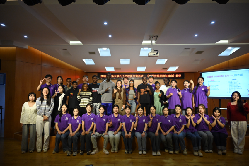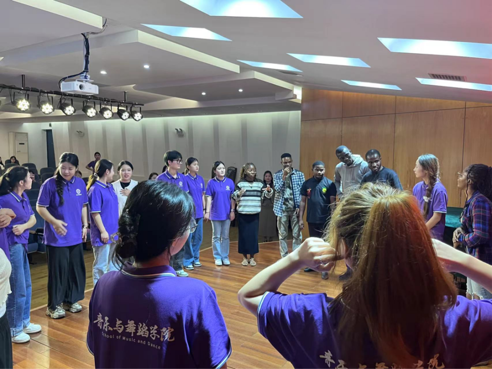 在湖南民歌《浏阳河》悠扬婉转的旋律带领下,步入了《中国传统文化与戏曲》的课堂。课程精心设计了民歌起源、多彩地域特色、民歌分类及益阳花鼓戏四大板块。其中,多彩民歌部分通过一领众和的演唱形式,让员工亲身体验中国多声部民歌的魅力;伟德国际1946的学子们还展示了湖北民歌《直尕思得》与云南民歌《猜调》,其生动有趣的表演让加纳营员们仿佛置身于民歌的海洋,深切感受民歌之美。益阳花鼓戏教学环节,加纳学子与音舞院学子携手合作,共同演绎了花鼓戏《刘海砍樵》的精彩唱段。最后,员工们纷纷上台交流展示中加两国的传统民歌,载歌载舞,最终在“好一朵美丽的茉莉花”的悠扬歌声中,为本次课程内容画上了圆满的句号。