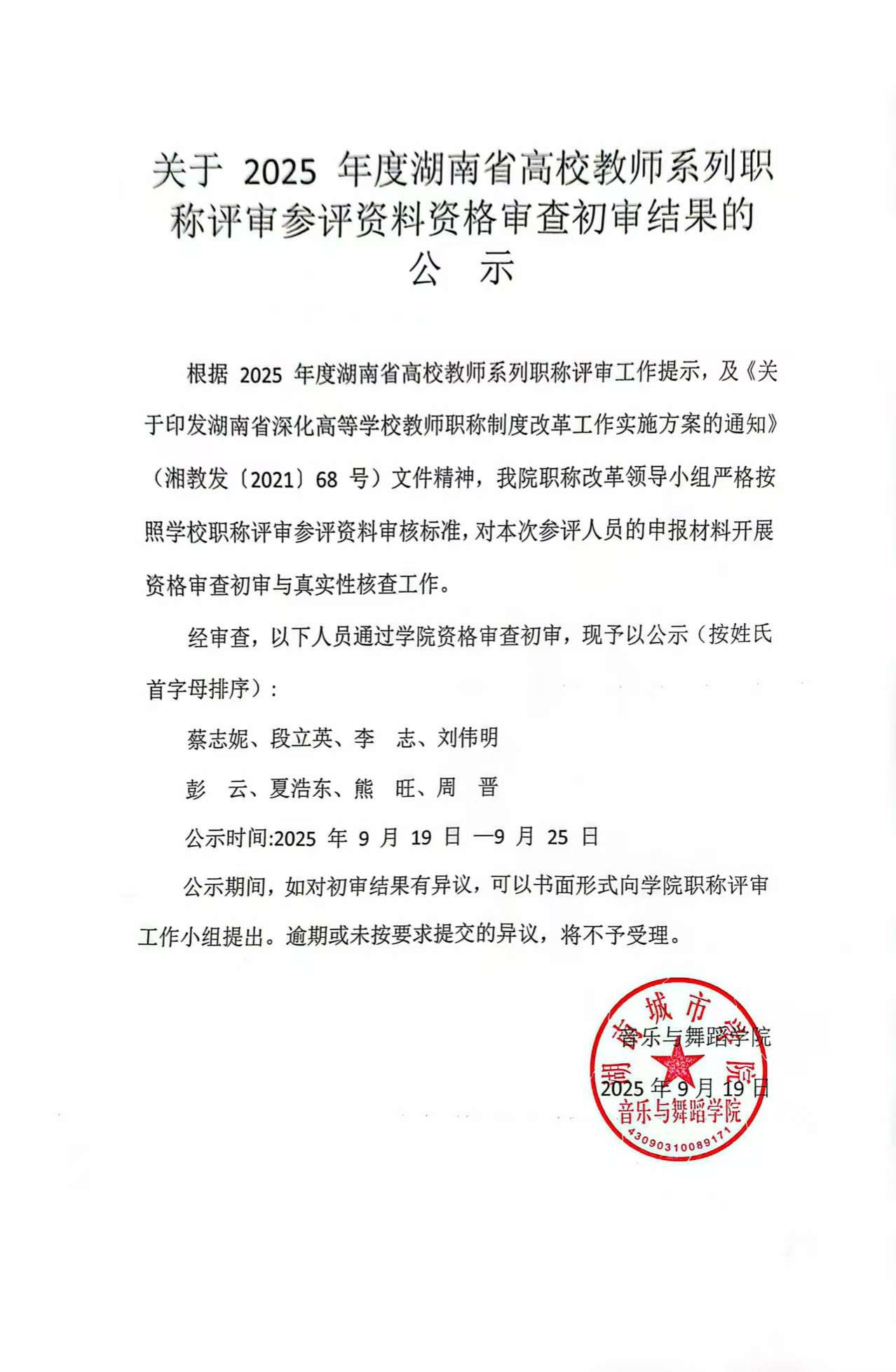 关于 2025 年度湖南省高校教师系列职称评审参评资料资格审查初审结果的公示