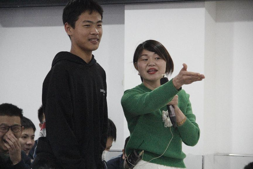 丁老师以“男生女生、变大变小”的热身小游戏为导入,介绍了包括“想象力、表现力、专注力”等在内“七力”及“幽默感、审美感、节奏感、形象感”构成的“四感”,从会场抽取四组人群组成一辆开往春天的列车,借助道具,形象诠释了春之音,生动演绎了春之美。