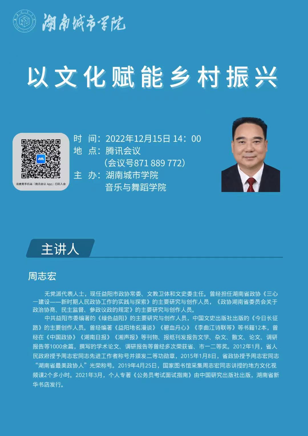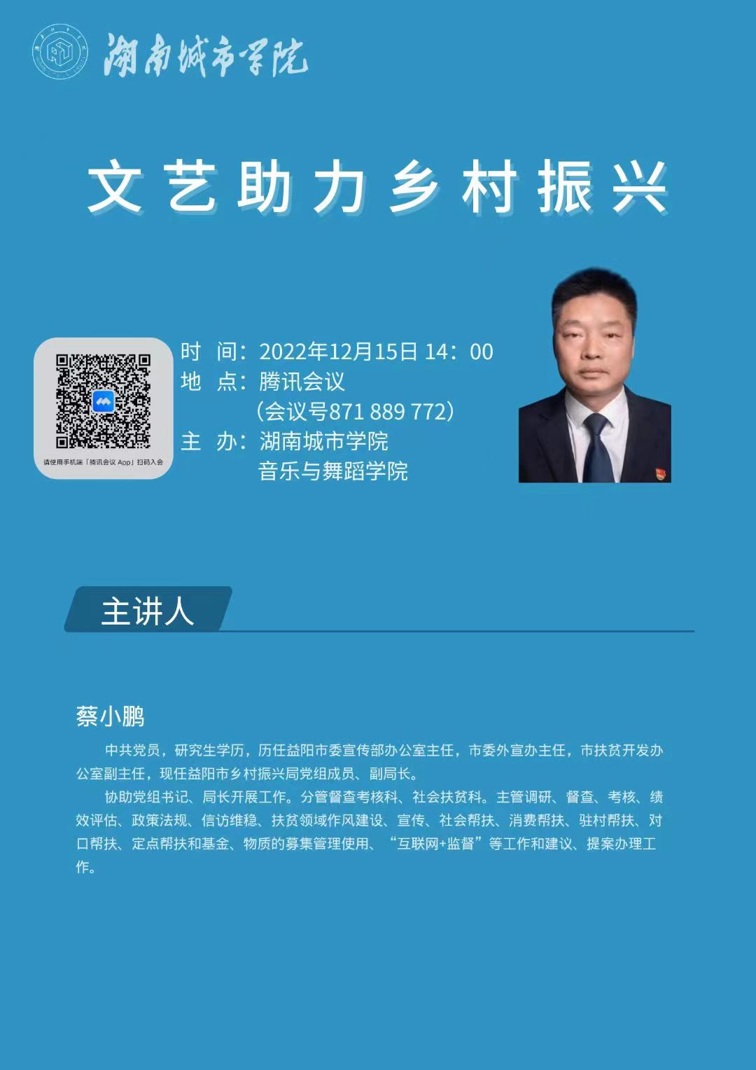 第二场讨论中,益阳市乡村振兴局副局长蔡小鹏以《文艺赋能乡村振兴》为题,结合益阳的一些知名文旅项目为案例,从地域特色、文化创新、音乐文化特征、传统音乐文化发展现状、国家以及省市各政府部门的政策方针等方面做了生动又详细的讲解。