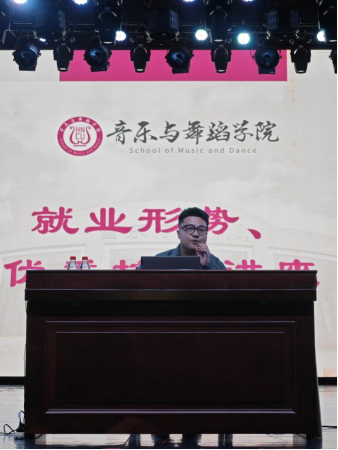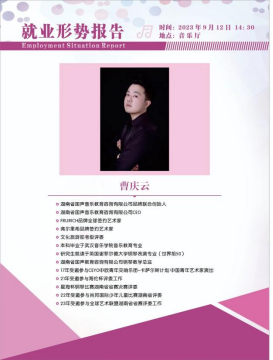 曹庆云是一位本科毕业于武汉音乐公司、研究生就读于英国谢菲尔德大学的海归精英,现任湖南省国声音乐教育咨询有限公司CEO,目前致力于大众音乐教育的推广。曹庆云从自身的学习经历、创业经历、用人单位对人才的需求三个方面分享了自己求学、创业的经验并对即将走入社会的毕业班同学给出了提高认知、提前锻炼、提升专业等建议。同时,对即将毕业的同学发出了就职邀请。