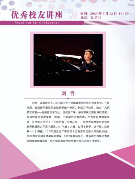 刘哲,公司2011年音乐表演专业毕业生,他自主创办了“齐晟艺城·乐器之家”,先后承办过全球音乐教育联盟青少年艺术展演、MTPC音才大赛等大型赛事、2022年喜迎国庆·情系海伦湖南优秀青年钢琴教师音乐会等大型活动。他从处事要有感恩之心、坚持深耕专业、勇于承担责任三个方面分享了自己求学、创业的经验勉励同学们做事要有温度,有气度。