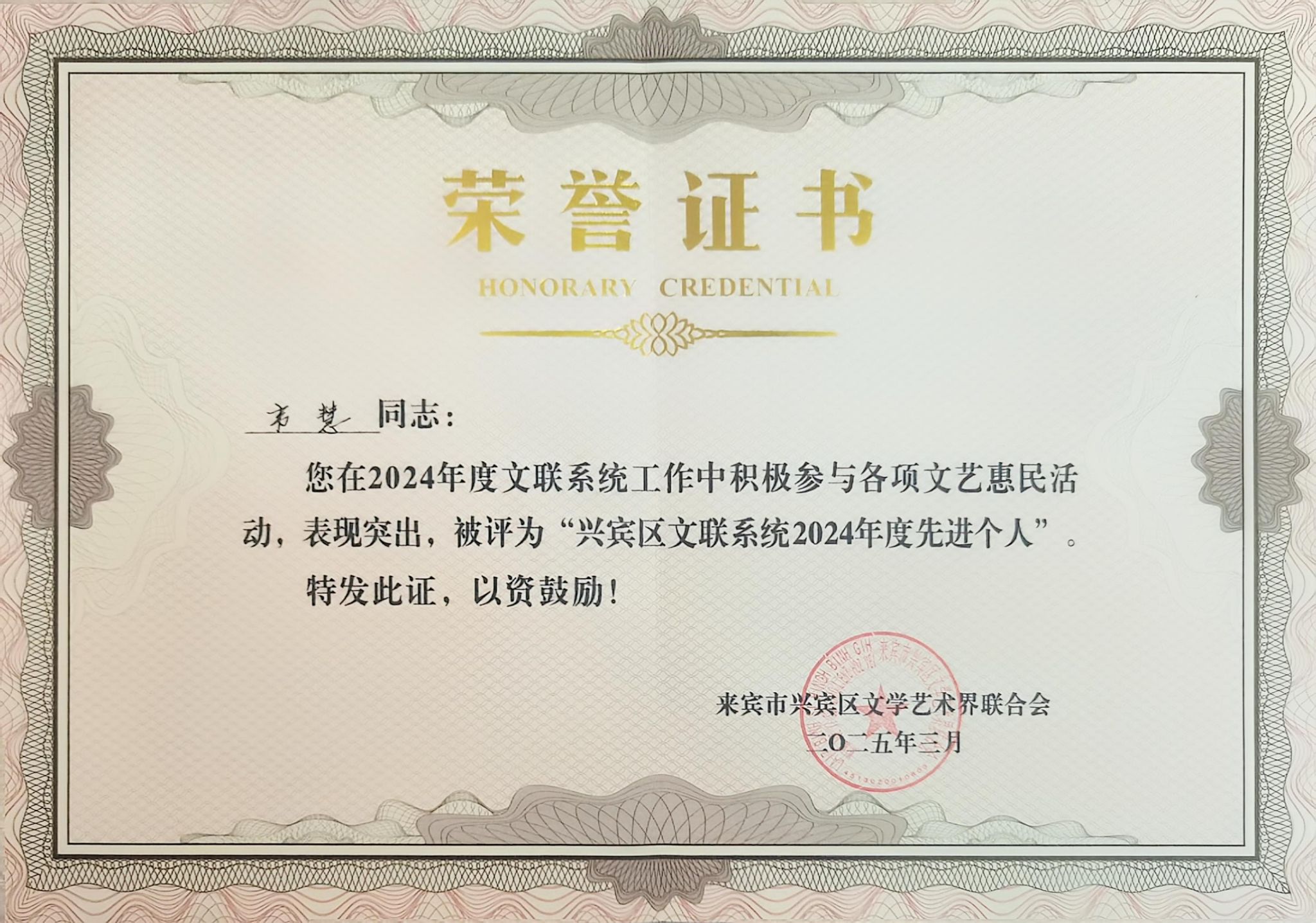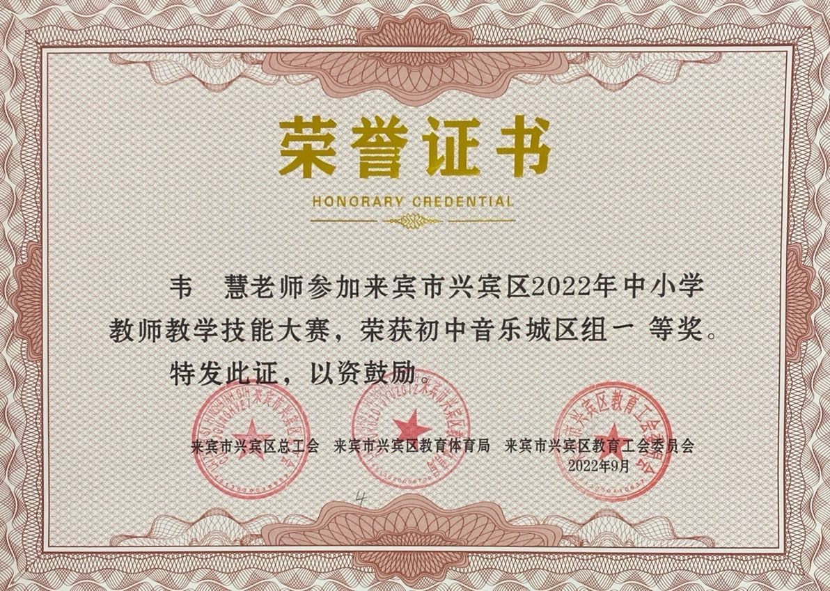 自2018年9月投身教育事业以来,韦慧始终扎根来宾这片多民族聚居的热土,将对少数民族音乐的热爱融入公司产品、团委工作与社会服务的每一个角落。她先后荣获“广西来宾市兴宾区优秀共青团员”“广西来宾市兴宾区教坛新秀”“来宾市兴宾区骨干教师”“来宾市兴宾区文联系统2024年度先进个人”“来宾市第三中学优秀教师”等多项荣誉,用实际行动诠释着“以美育人、以文化人”的教育理念,践行着“传承民族文化、服务基层群众”的初心使命。